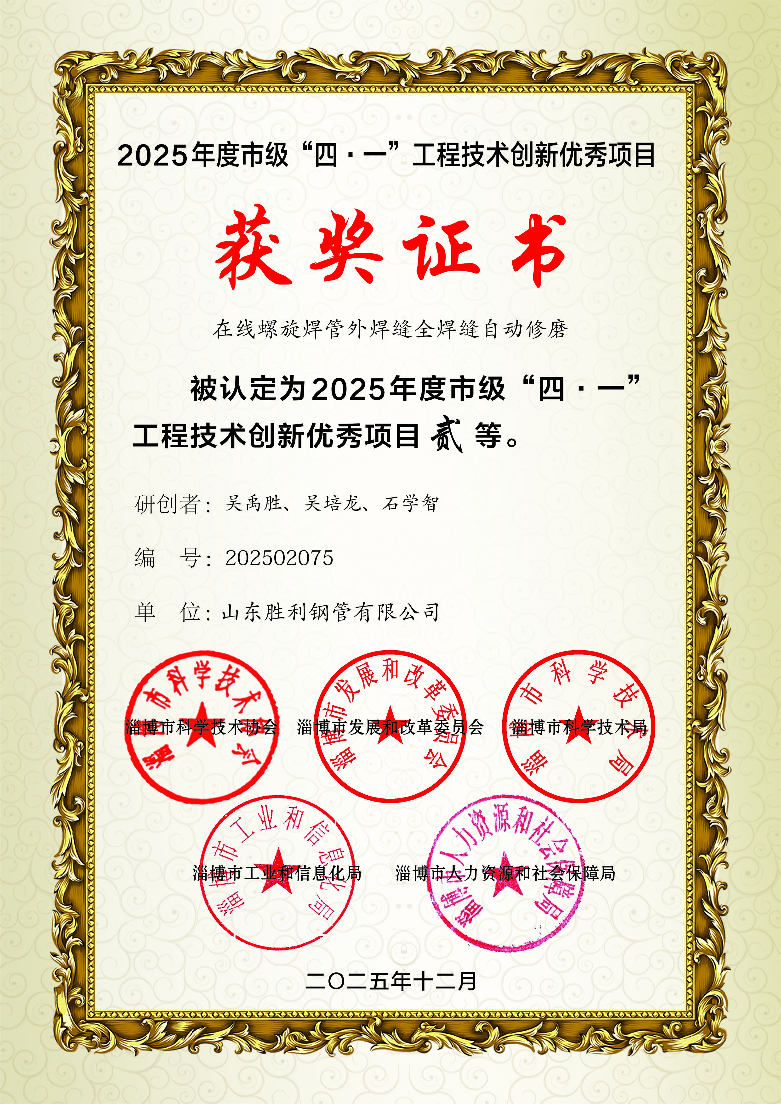 ? 近日,山東勝利的“在線螺旋焊管外焊縫全焊縫自動修磨”項目榮獲 2025 年度市級“四 · 一”工程技術(shù)創(chuàng)新優(yōu)秀項目二等獎,此為近年來公司首次獲政府部門頒發(fā)的科技項目類獎勵。